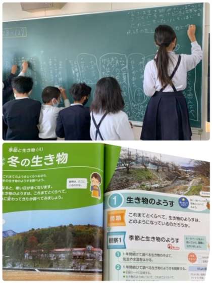 4年生の理科の授業の様子です。単元「冬の生き物」の学習に入りました。課題「これまでとくらべて、生き物のようすは、どのようになっているのだろうか」について考えています。まず、自分の考えをノートに書き、黒板に書きだしています。たくさんの考えが出ていますね。