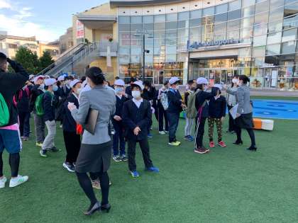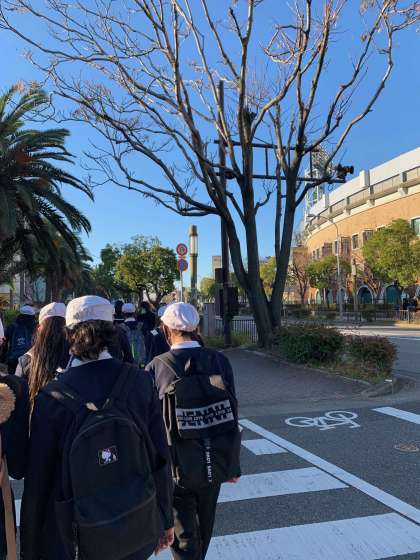 甲子園球場横を通って、キッザニアに到着しました。入場前の検温をしています。