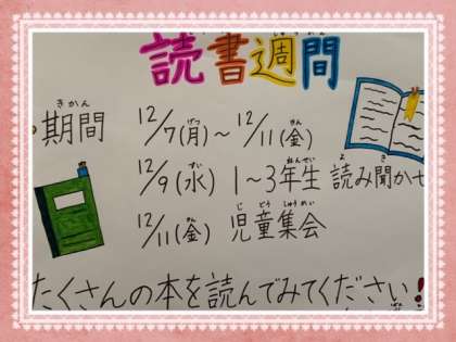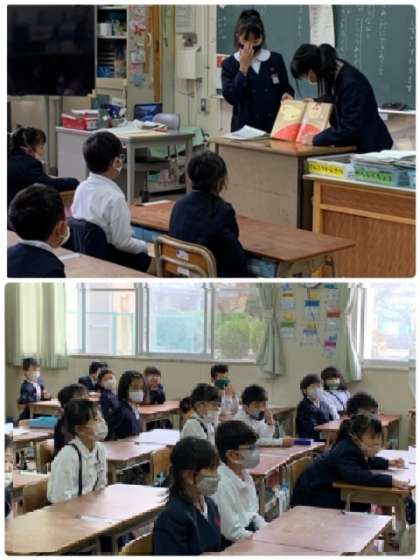 12月9日(水)、今日は朝の「読書タイム」の時間に、図書委員が1〜3年生の教室で「読み聞かせ」をしてくれました。1〜3年生が、図書委員の読み聞かせに集中して聞いている姿が印象的でした。