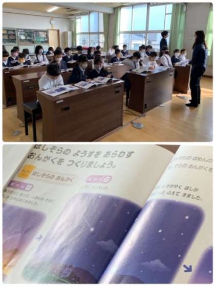 1年生の音楽の授業の様子です。音楽室で学習しています。課題「ほしぞらの ようすを あらわす おんがくを つくりましょう。」に取り組んでいます。