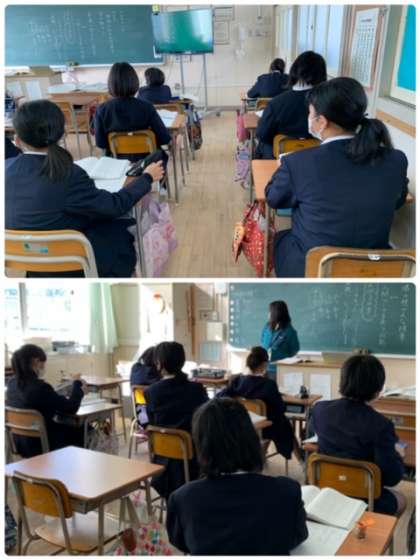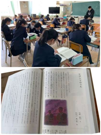 6年生1・2組の国語の授業の様子です。「ヒロシマのうた」の学習をしています。呉の山の中で訓練を受けた水兵さんが、広島に原爆が落とされた日の夜、広島の町に行き、目撃したこと、そして、体験したことが書かれています。