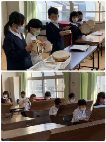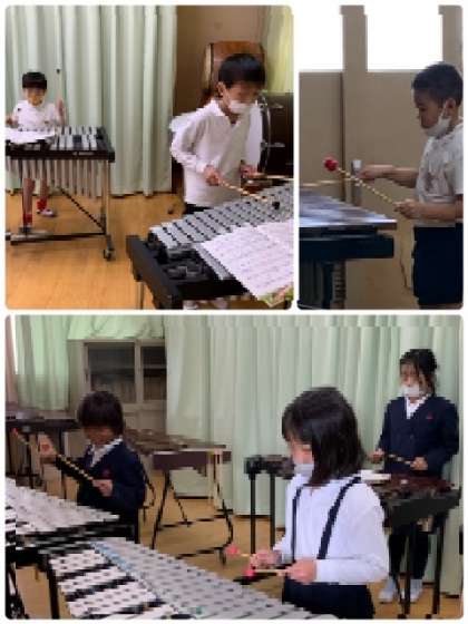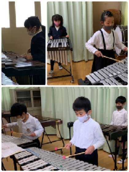 ローテンションして、全員がすべての楽器を演奏しました。曲「アイアイ」の合奏を、楽しんでいます。