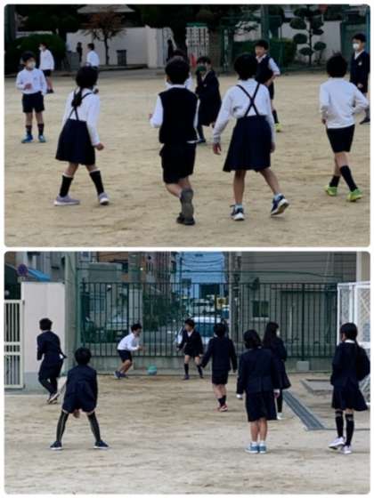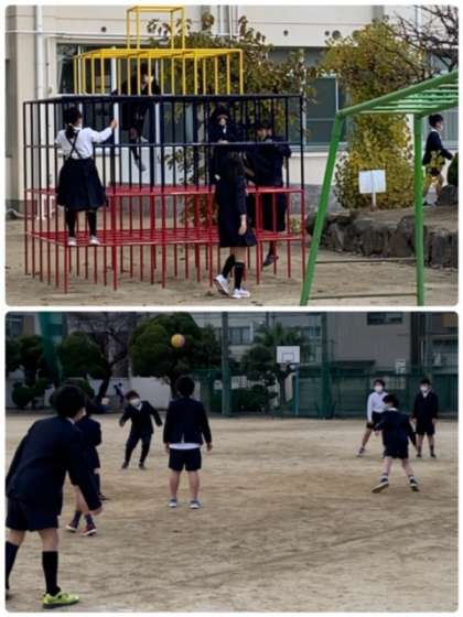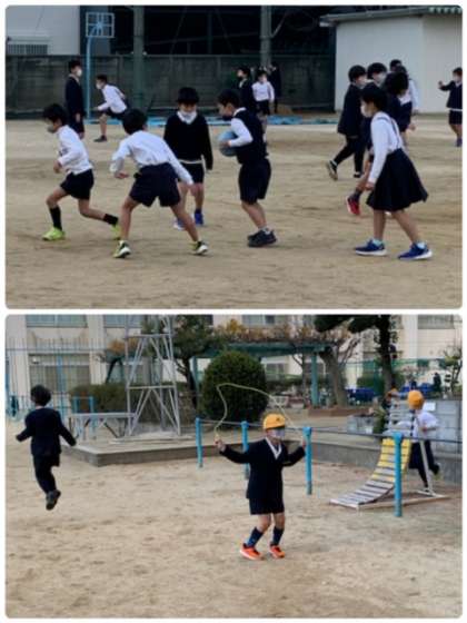 2学期最後の日、休み時間にたくさんの児童が運動場で遊んでいます。学級で「みんな遊び」をしている学級もあります。体育の時間に取り組んだ「なわとび」を練習している児童もいます。それぞれの休み時間を楽しんでいますね。