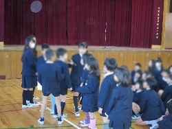 2月6日金曜日、児童集会で、集会委員会による「ならべかえゲーム」がありました。足のサイズ順に並んだり、学年順に並んだりして、間違わずにはやく並んだ班の勝ちです。はやくても間違うと失格になります。写真は、集会委員会の人があっているか確認しているところです。