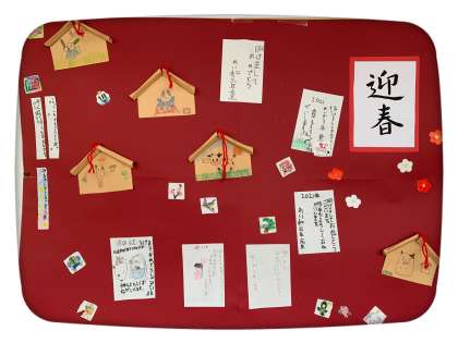 ポプラ学級の児童たちが作成した「絵馬」や「新年のあいさつ」が、掲示板に飾られています。よろしければ、ご覧ください。