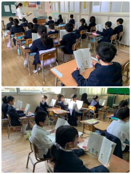 続いて、全員で声を合わせて音読をしました。教科書の持ち方や姿勢に気をつけて、しっかりとした発声で、音読していました。
