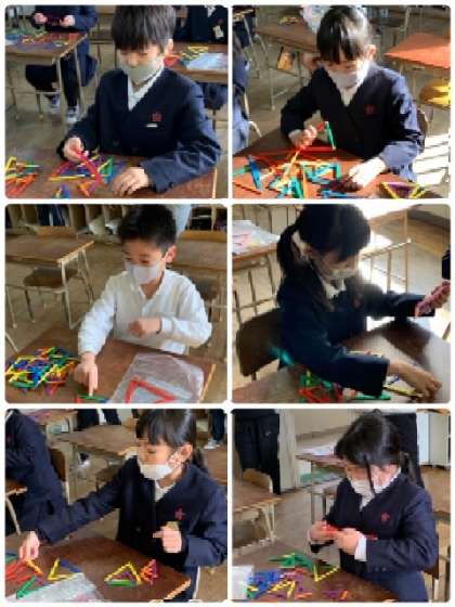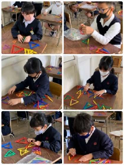 前の時間に、自分で作ったいろいろな三角形を「仲間分け」しました。いろいろ悩みながら分けています。