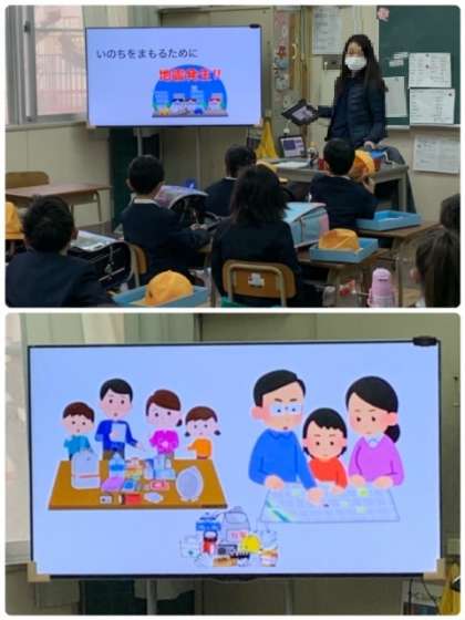そして、今日は、お家の方と一緒に話をしてほしいという宿題が出ています。ぜひ、時間を作っていただき、今日の学習したことを聞いていただくとともに、親子で一緒に、「地震が来た時に、どこに避難するのか。」「我が家の防災備蓄」についてお話しいただけるとありがたいです。お願いいたします。