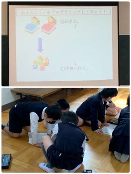 2年生 プログラミング 公開日 2021/01/19 更新日 2021/01/19 お知らせ 2年生1・2組合同で、「プログラミング」について学習しました。今日は、パソコンを使わない学習です。課題「あさのよういをプログラミングしてみよう!」に取り組んでいます。課題を通して、プログラミングは、どのようなものかを学習しています。 いいね(0)