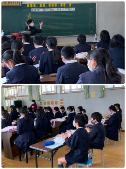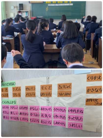 6年生の音楽の時間です。鑑賞の授業をしています。曲「ハンガリー舞曲 第5番」を聴いて、旋律のくり返し部分や変化しているところに注目しました。