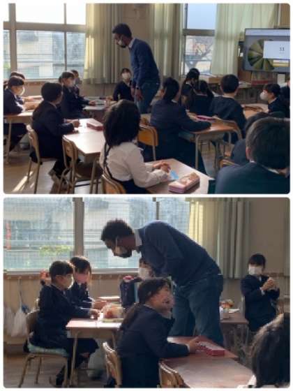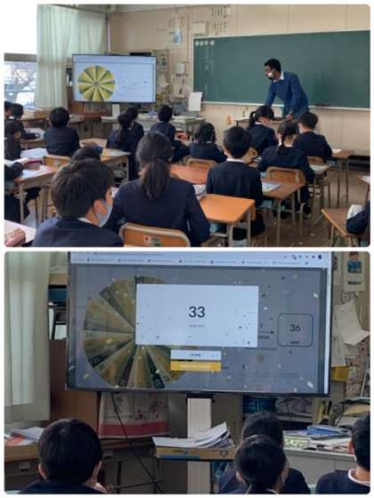 3年生の外国語の時間の様子です。今日は、C−NETの先生と一緒に学習しています。最初に「今日は何月何日?」「今日の天気は?」「元気ですか?」と先生との会話が進みます。今日は、ルーレットで会話の相手が決まるので、みんなドキドキハラハラ・・。
