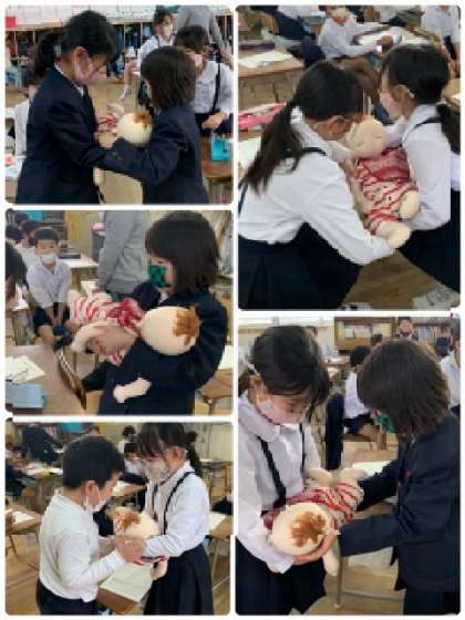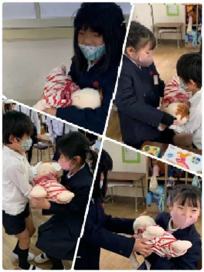 先生から、首がまだ安定していないので、支えながらだっこするように教えてもらいました。少しドキドキしながらも、みんな思わず笑顔になっていますね。