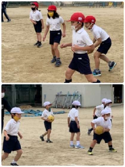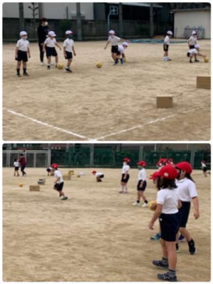 1年生の体育の授業の様子です。これまで練習してきたサッカーボールのキックを利用して、オリジナルのゲームを楽しみました。