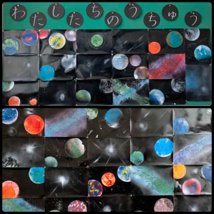 できあがったみんなの作品を、掲示板に飾っています。ポプラ学級全員で作った作品「わたしたちの うちゅう」です。学校にお越しの際には、ぜひご覧ください。