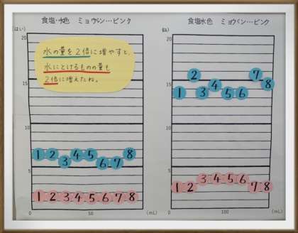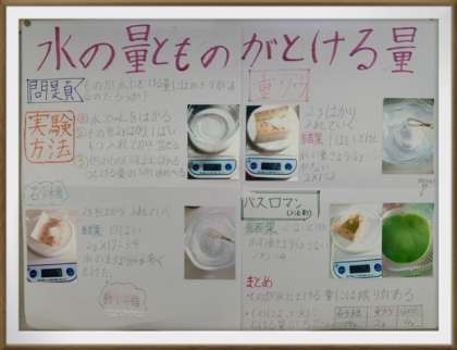 5年生が、実験「水の量とものがとける量」の結果をまとめてくれました。今、教室前廊下に掲示しています。