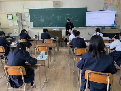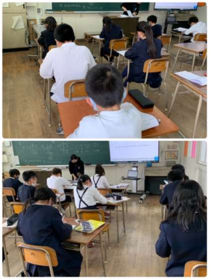 4年生は、1学級を2つに分けて、算数と社会の学習をしました。算数の授業の様子です。「あまりのある小数のわり算」を学習しています。教科書の問題を使って解き方を学び、計算ドリルで練習をしています。
