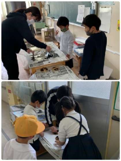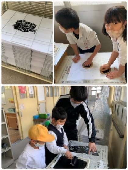 昨日に引き続き、図工作品に取り組んでいます。今日は、完成までがんばりました。1年生のみんなが作成しているのは、紙版画の版でした。出来上がった児童から、ローラーを使って版画を完成させました。作品が乾くのが待ち遠しいです!