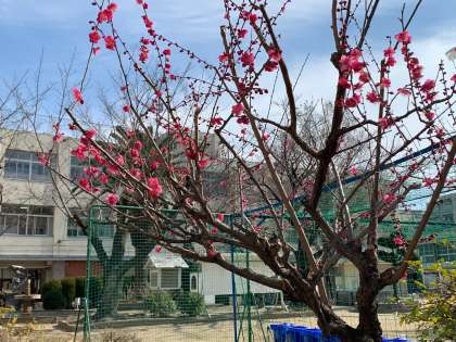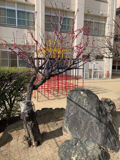九条北小学校の中庭の紅梅の花が開いてきました。