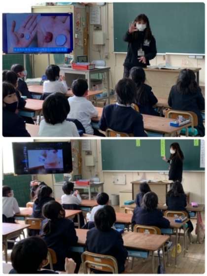 今日の教材に出てくる「ハムスター」が写真で紹介されると、「かわいい〜」と声が出ていました。写真や動画で、生まれたばかりのハムスターの赤ちゃんの成長の様子を、みんなでみていきました。