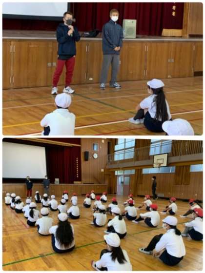 まずは、5年生対象に「夢授業」が始まりました。自己紹介の後、さっそくカクさんとアシスタントのマオさんによるデモンストレーションダンスを見せてくれました。