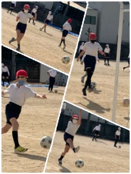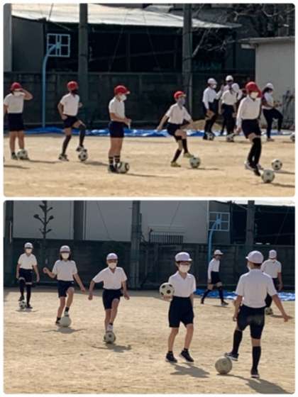 5年生の体育の授業で、サッカーに取り組んでいます。今日は、実技の確認テストも兼ねているようです。半数ずつに分かれて、一人一人のボールさばきをみていっています。もう半数のグループは、シュートの練習をしています。