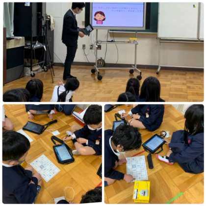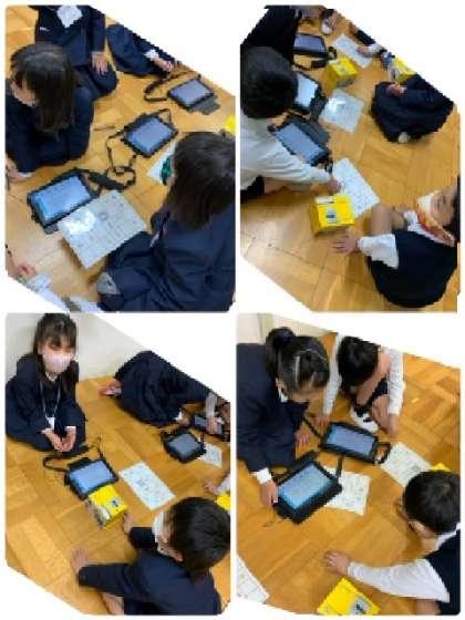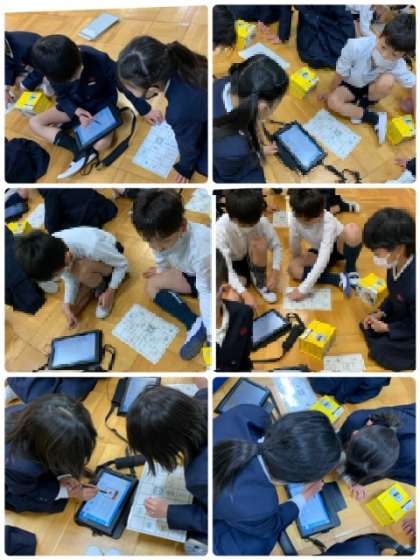 ペアで相談しながら取り組んでいます。まずは、タブレットでプログラミングのカードの並べ方を考えています。