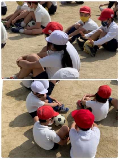 次はペアでボールパスの練習をします。ボールを蹴るときに、どこで蹴るとよいのか教えてもらっています。
