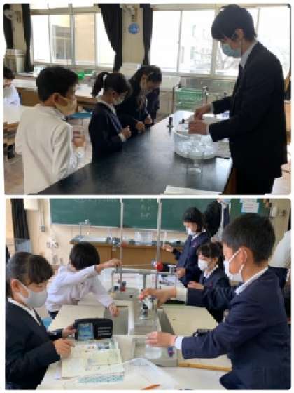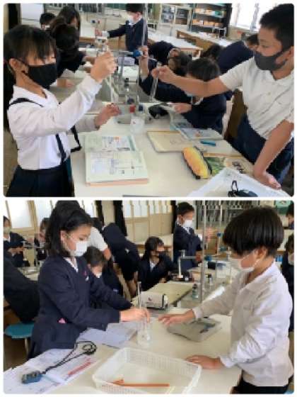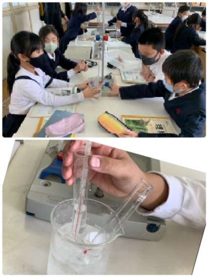4年生の理科の授業の様子です。2分割の人数で時間を分けて実験をしました。今日の実験は、「水を冷やした時の変化」について調べました。氷水を入れたビーカーに、水を入れた試験管を入れます。2分ごとに、水の温度と水の様子を調べて、実験ノートに記入していきました。