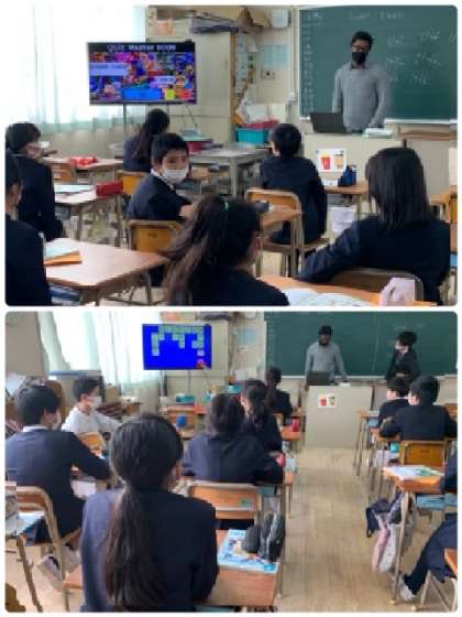 6年生 外国語 公開日 2021/03/09 更新日 2021/03/09 お知らせ 6年2組の外国語の時間です。今日は、6年生にとって、C−NETの先生との最後の授業です。クイズ大会をしてくれました。2つのチームに分かれて競います。選んだ問題に、英語で答えます。これまでに学習した内容を使った問題です。正解のときには、ランダムに得点が出てきます。英語が得意な児童も、得意でない児童も、楽しんでいたようです。 いいね(0)