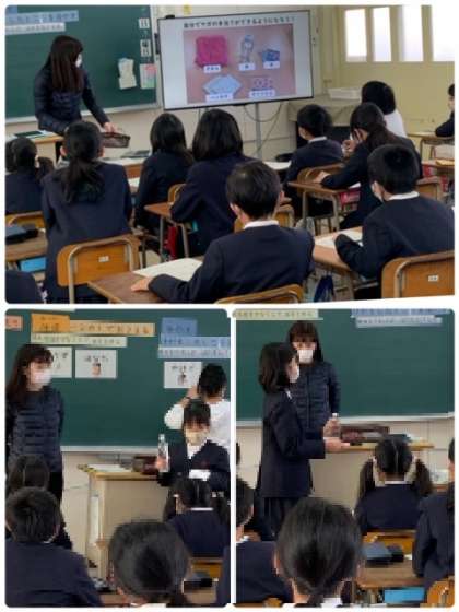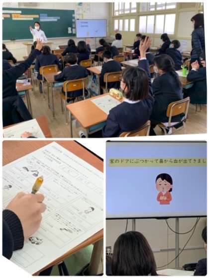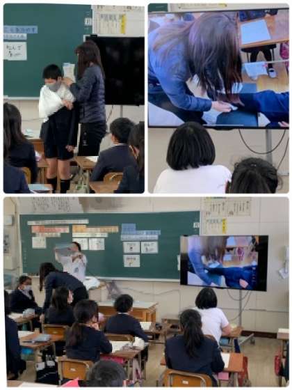 それぞれの事例の時に、近くにあるものを、どう活用したらよいかも実物を使って考えました。さらには、応急処置での三角巾の使い方やAEDについても教えてもらいました。