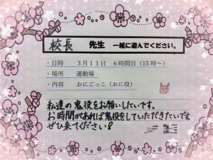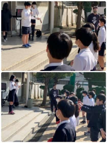 3月11日(木)6時間目、卒業を前に6年生児童が企画した「卒業イベント」を行いました。たくさんの先生方も参加してくれました。6年生が考えたのは、「逃走中」です。まずは講堂前に集まり、開会式です。