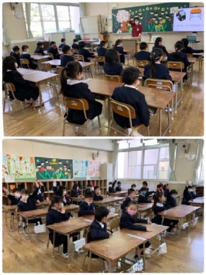 1年2組の「朝の会」の様子です。朝の健康観察をしています。先生に名前を呼ばれた児童は、「はい!元気です。」と答えています。