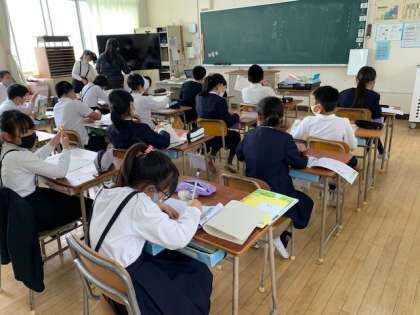 5年1組のパワーアップタイムの時間の様子です。連絡帳を書き終えて、漢字ドリルに取り組んでいます。