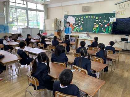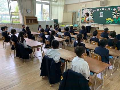 1年生の教室では、自己紹介をしていました。「なまえ」と「すきなもの」を紹介し、最後に「よろしくおねがいします」と、みんなに伝えました。