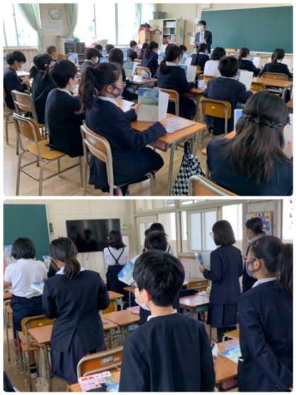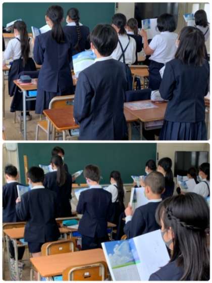 6年1組の国語の時間です。詩「いのち」の音読をしています。しっかりとした姿勢で、中には、すでに詩を覚えている児童もありました。先生からは、よりすばらしい音読をするには・・・について、教えてもらっていました。