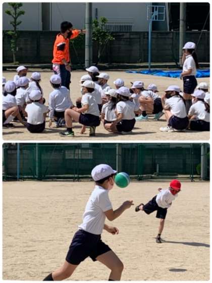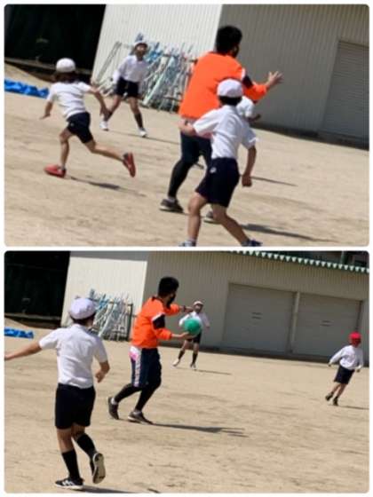3年1組の体育の時間の様子です。ボールを受けたらセーフ、当てられたら鬼が増えていくゲームをしています。