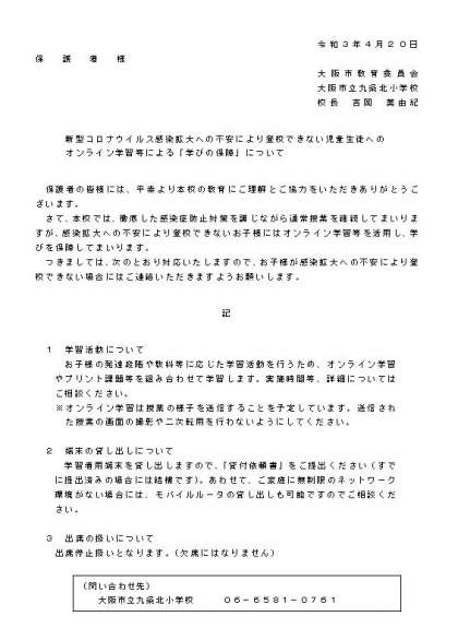 本日、「新型コロナウイルス感染拡大への不安により登校ができない児童生徒へのオンライン学習等による『学びの保障』について」という手紙をお配りしています。