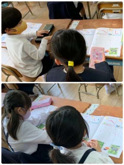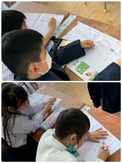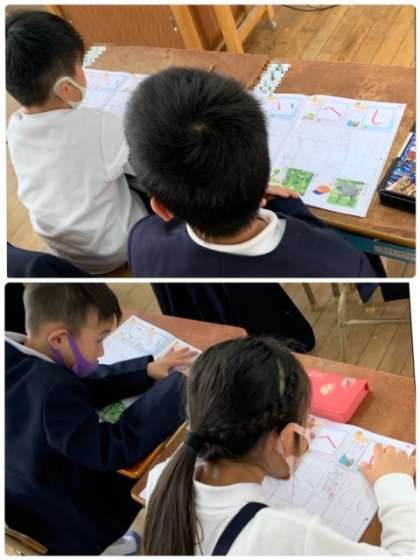 ひらがなの練習帳の字をなぞって形をしっかり覚えて・・・。