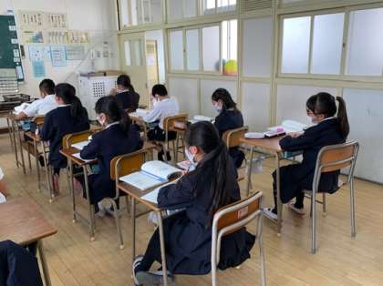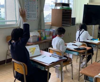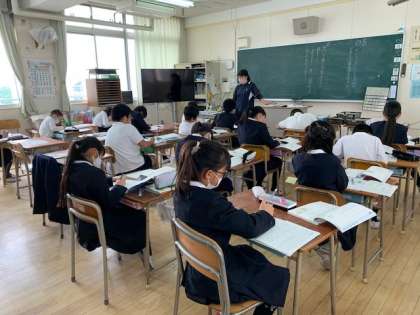 5年1組の教室の様子です。国語の「だいじょうぶ だいじょうぶ」の学習をしています。音読をするときに、思いや優しさが伝わるように、声の大きさや速さ、間の取り方などに気をつけるとよいことを学びました。