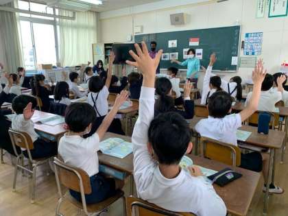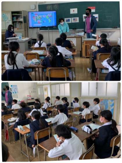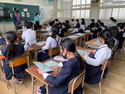 4年1組の教室の様子です。C−NETの先生も一緒に外国語の授業をしています。今日の学習は、教科書の「Unit1 Hello,world!」の学習です。世界の国々のあいさつを教えてもらっています。