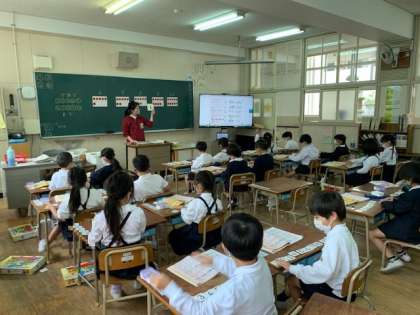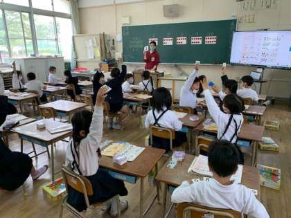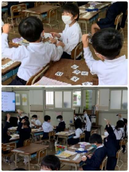 1年2組の教室の様子です。先生が選んだ数字を、10枚のカードの中からすばやく見つけることができていました。