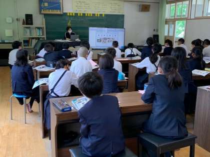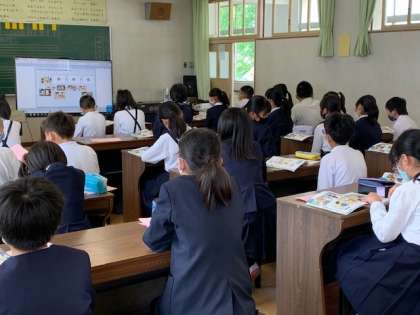 5年生の様子です。1・2組合同で外国語を学習をしています。自己紹介の仕方を考えています。