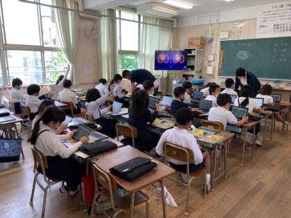 3年1組の教室の様子です。学習用端末の操作を練習しています。家庭学習の際に活用できるように、理科の教科書に掲載されているQRコードの読み取り方を教えてもらいました。
