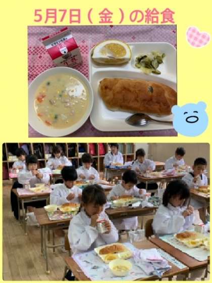 5月7日(金)今日の給食は、「コーンクリームシチュー、キャベツときゅうりのサラダ、かわちばんかん、レーズンパン、牛乳」です。