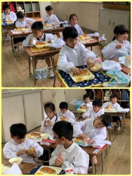 1年1組の給食の様子です。「かわちばんかん」、上手に食べれたかな?
