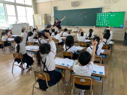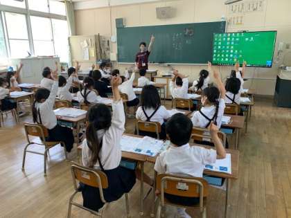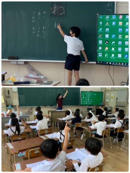 1年2組の教室の様子です。1組に同様に、ひらがなの練習をしています。注意するところを確認しながら、手を大きく使って、書き順も覚えていきました。