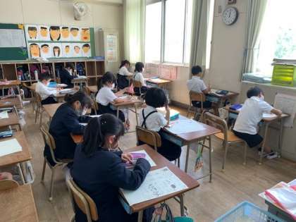 2年1組の教室の様子です。算数の単元「たし算」の確認テストをしています。日頃の学習の成果は出せたでしょうか。