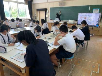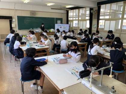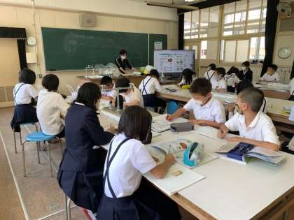 5年1組・2組で、理科の単元「植物が成長する条件」の学習をしています。これから、日光や肥料と植物の生長の関連を調べる実験をします。まずは、予想をたてて、ノートに書きました。
