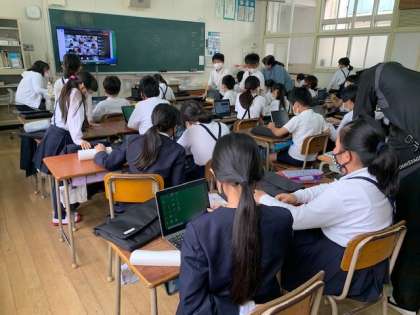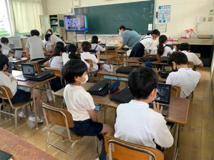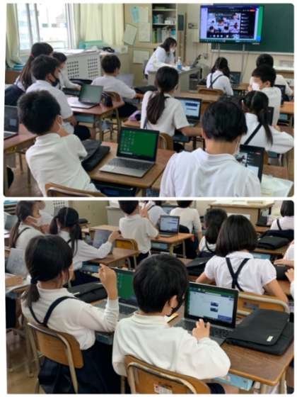 4年生の教室です。先日教えたもらったばかりの、双方向通信アプリ「Teams」のチャット欄を活用していました。先生から「好きなものは?」と聞かれて、それぞれがチャット欄に記入する形で答えていました。