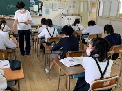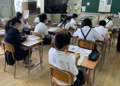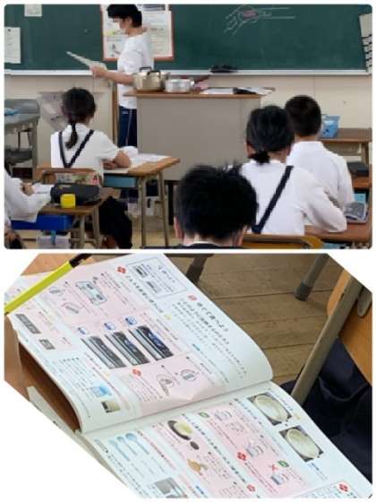 5年1組の教室の様子です。家庭科の学習で、調理をする際の基本的な内容を教えてもらっています。
